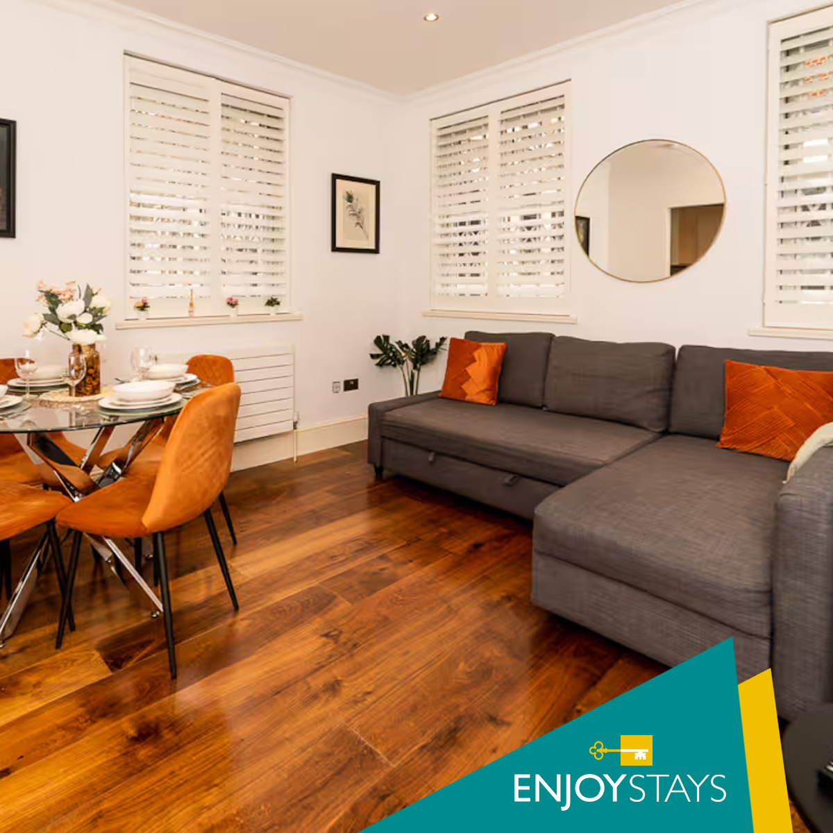 Modern and bright 1-bedroom apartment accessible by lift, offering a comfortable stay in central London. The flat features an open-plan living and dining area with wooden floors, a comfortable sofa, wall-mounted TV with Netflix, and a fully equipped kitchen. The dining space is ideal for meals or remote work. The bedroom includes a comfortable double bed with fresh linens and warm lighting. A clean, modern bathroom offers a full-size bathtub with shower.